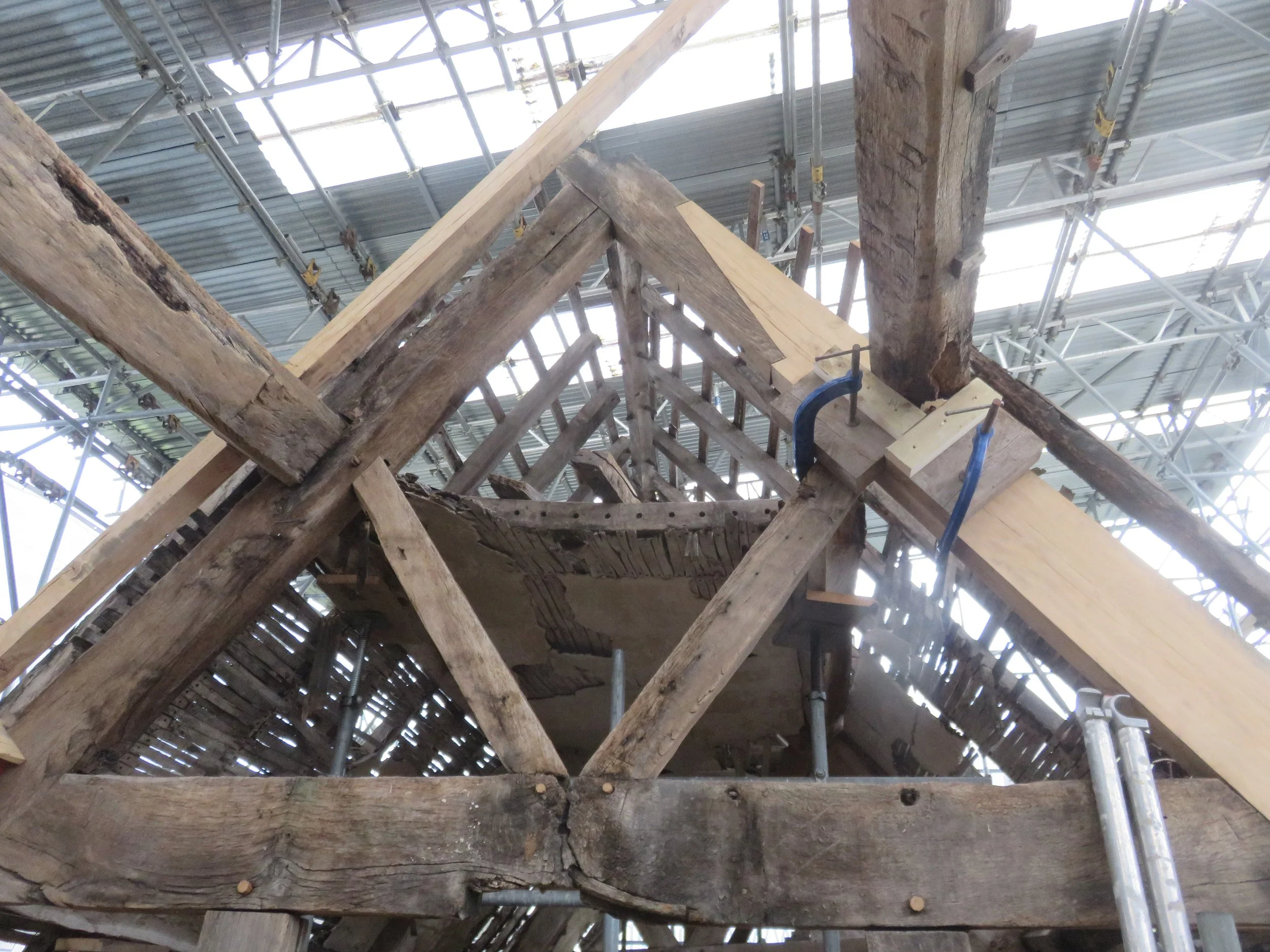 Our contractors, D A Cook are making progress with repairs to the four 1680's roof trusses over the "bridge" . This requires highly skilled work which is being monitored by Historic England, our architect and structural engineer and trustee David Viner.